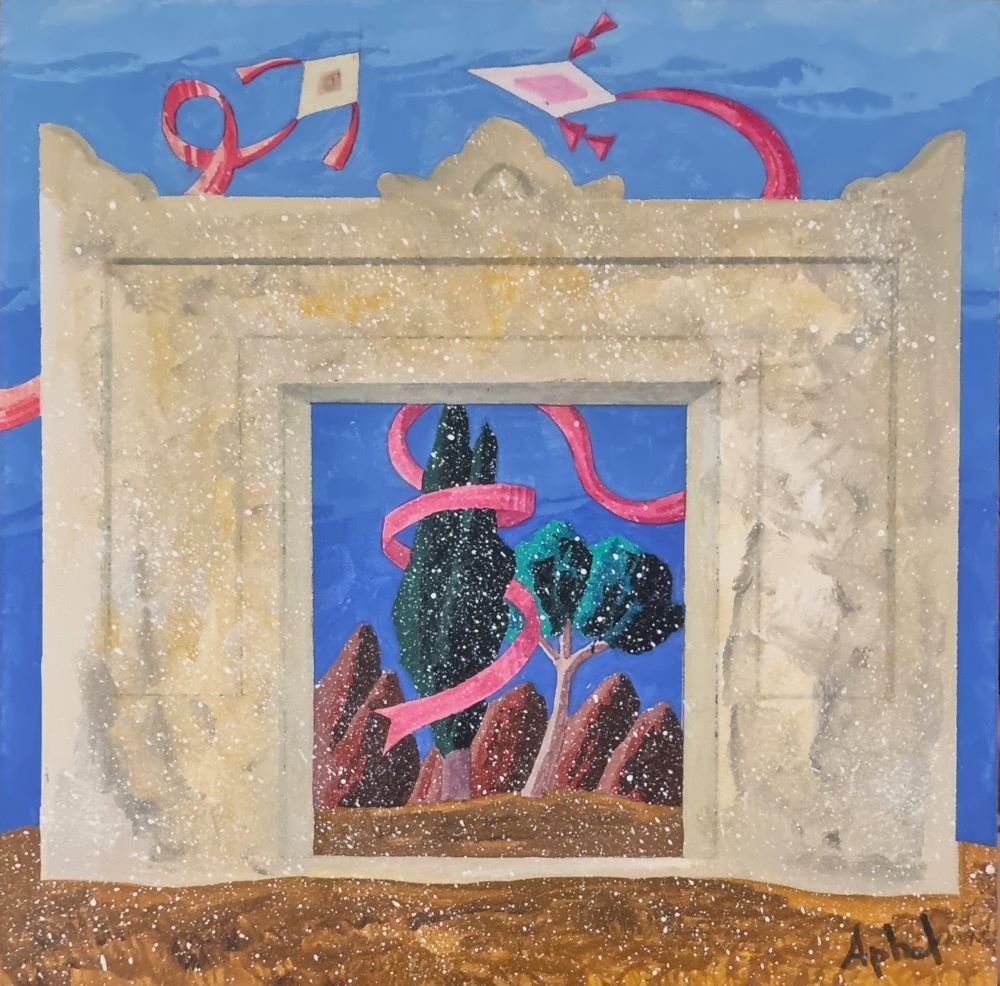 APHEL FABIO Cavalese (TN) 1957 "Casa aquilone" Olio su tavola cm 25x25. Firmato sul fronte in basso a destra. Al verso firma, titolo e numero d'archivio.