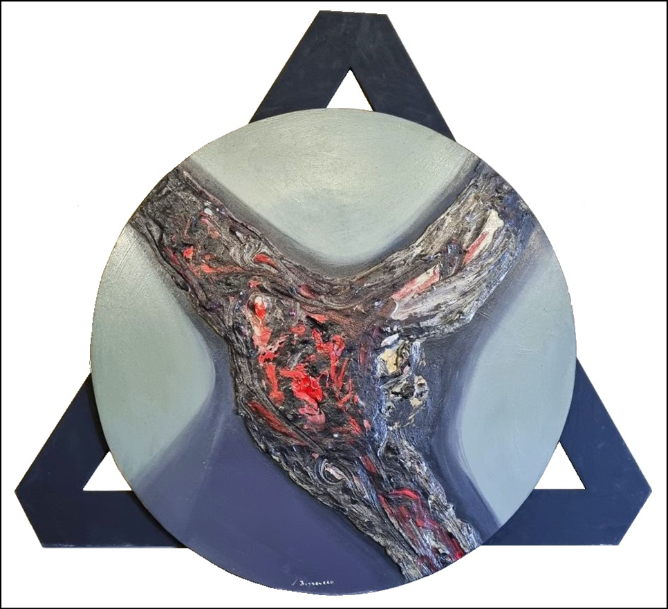 BISSACCO MARTINO Taglio di Po 1941 "Il riposo del vegetale" Tecnica mista su tavola circolare, diam. cm 70, applicata su supporto in legno cm 86x86 (totali). Firmata sul fronte in basso a destra, al verso misure, titolo e firma. Certificato di provenienza a cura di Allegrini Arte.