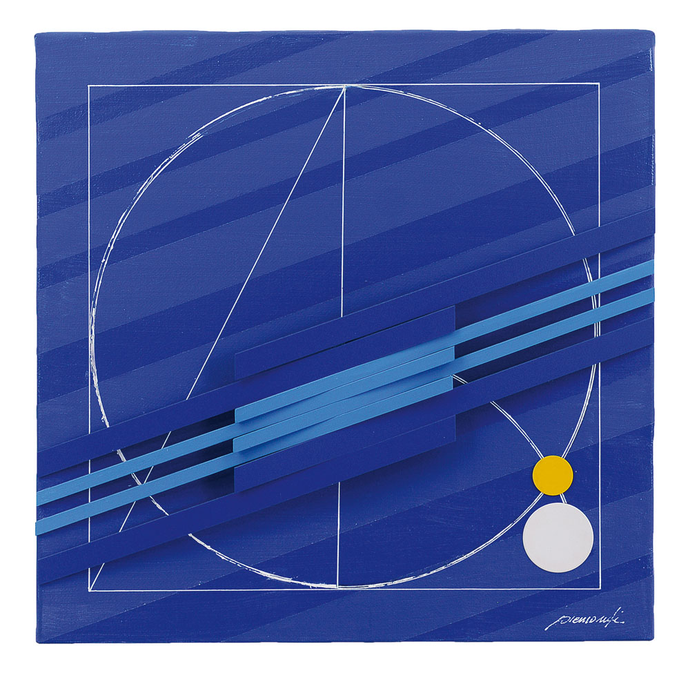 acrilici e rilievi su tela cm. 50x50x3; firma, anno, etichetta e archivio dell'artista al retro, dichiarazione d'autenticità e archivio dell'artista su foto, entro teca in plexiglass.