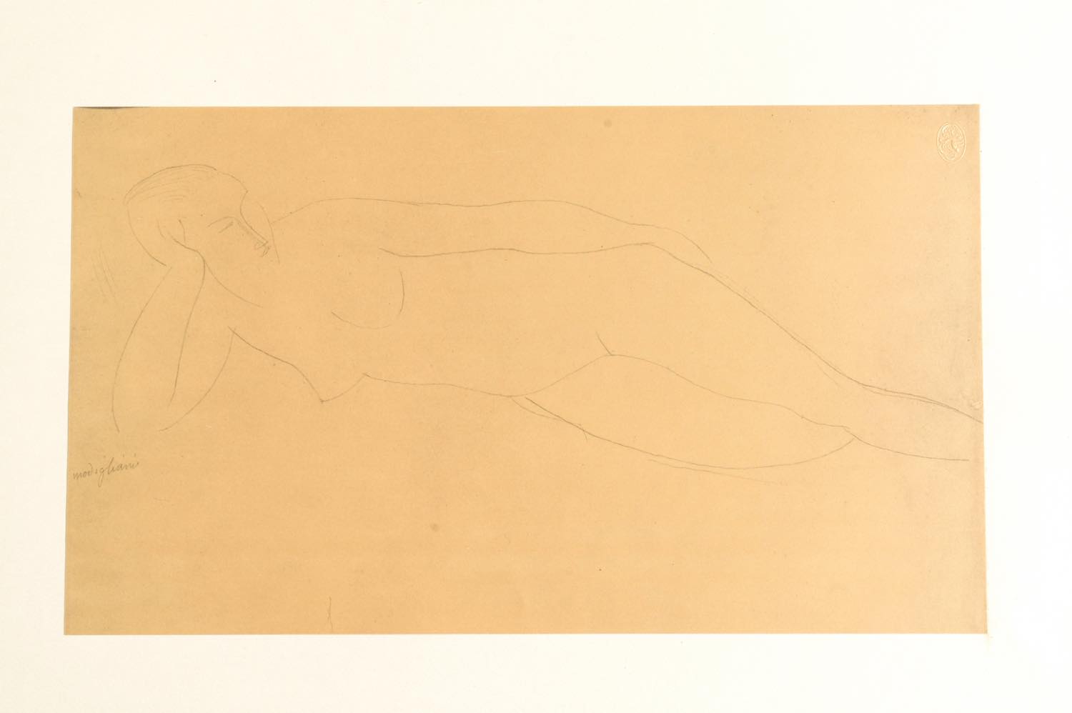 Amedeo Modigliani (Livorno 1884 – Parigi 1920), “Nudo disteso”. - Fotolitografia su carta, firmata in basso a sinistra, reca in alto a destra timbro a secco Einaudi, H cm 23x40.5