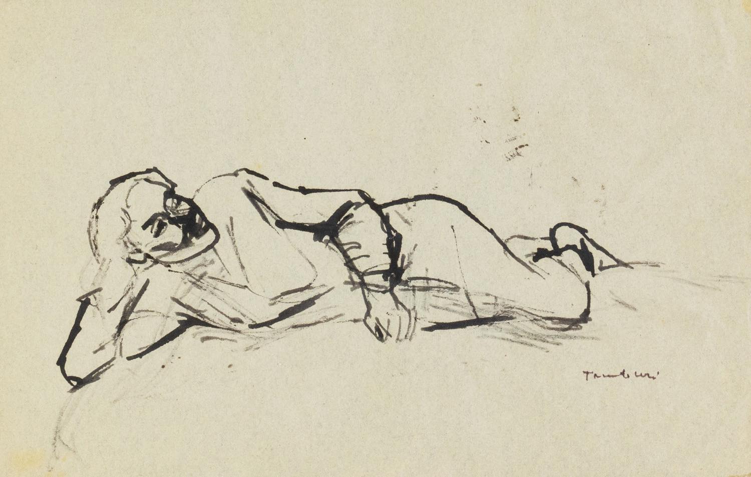 Orfeo Tamburi (Jesi 1910 - Parigi 1994), “Donna distesa”, Anni ‘40. - China su carta, firmato in basso a destra, H cm 20x30