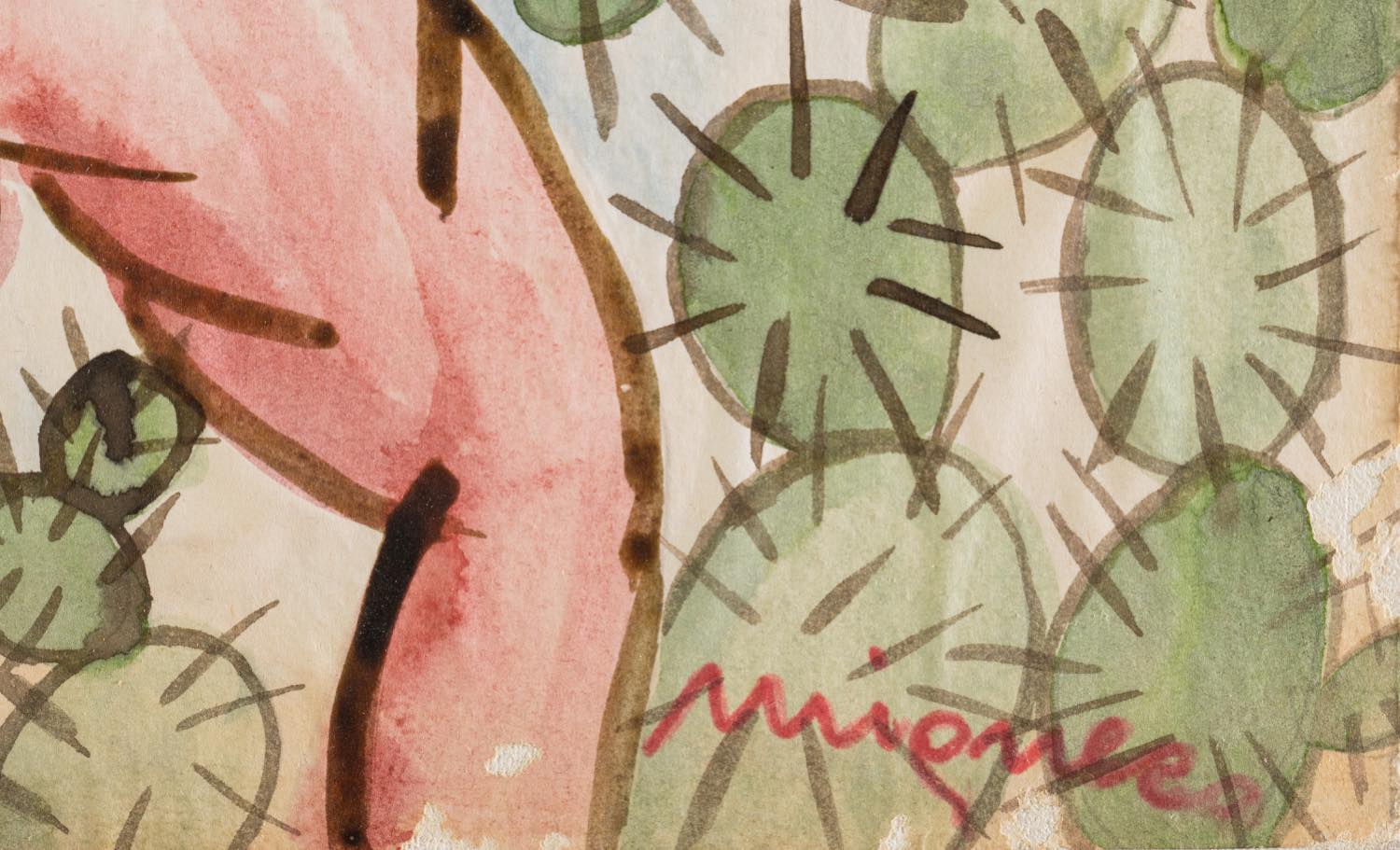 Giuseppe Migneco (Messina 1903 - Milano 1997), “Contadino tra i fichi d’India”. - Acquerello su carta, firmato in basso a destra, H cm 30x20 (difetti)