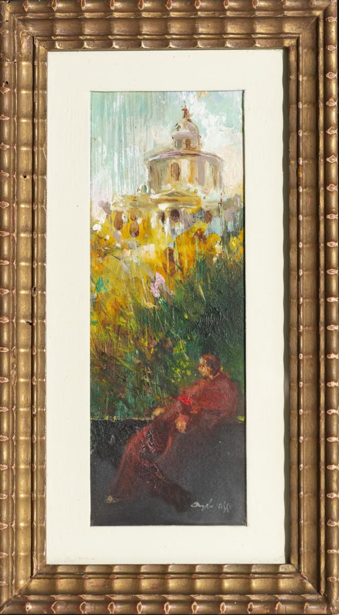 Angelo Tassi (Bologna 1937 – 2024), “Cardinale a San Luca”. - Olio su cartone, firmato in basso a destra, H cm 22.5x8