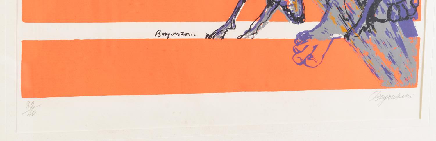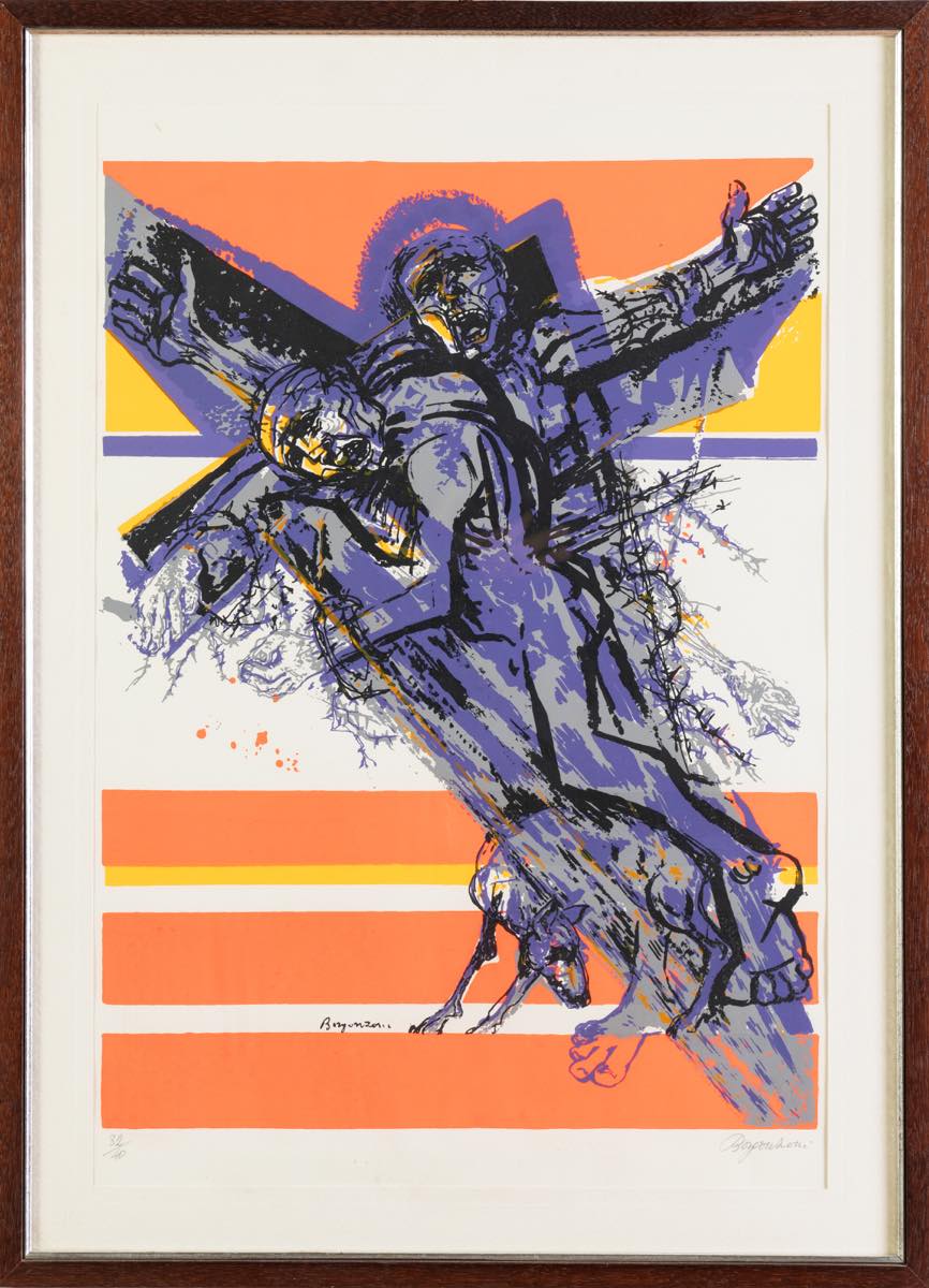 Aldo Borgonzoni (Medicina 1913 – Bologna 2004), “Crocifissione”. - Litografia a colori su carta, firmata in basso al centro sulla lastra, in basso a destra sul foglio, numero di tiratura in basso a sinistra 32/40, H cm 61.5x42