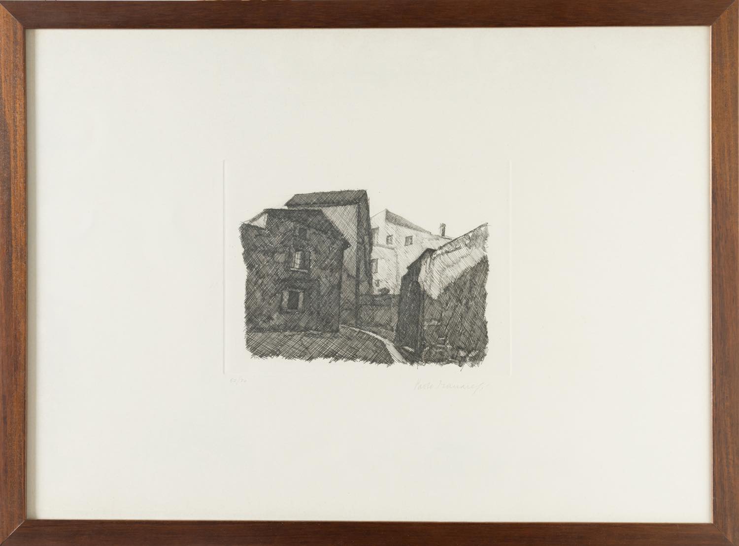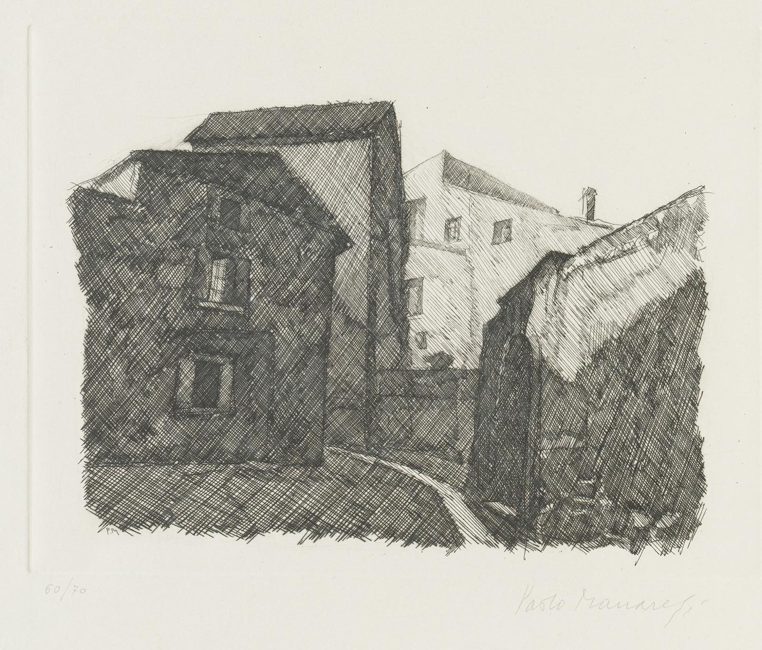 Paolo Manaresi (Bologna 1908 - 1991), “Case”. - Incisione su carta, firmata in basso a destra, numero di tiratura in basso a sinistra 60/70, Lastra H cm 21.5x28.5