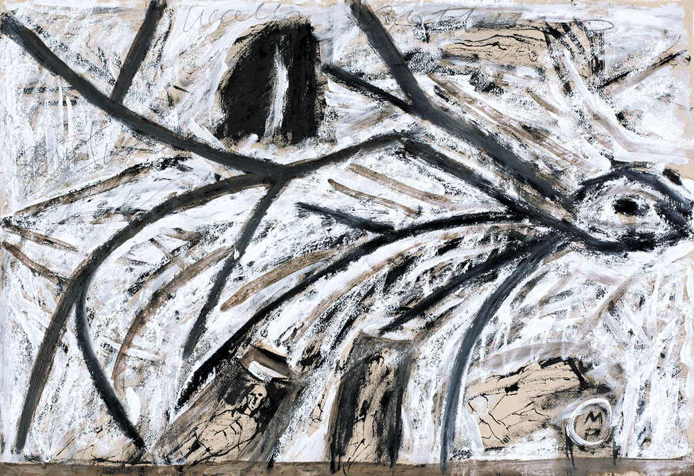 tecnica mista e olio su carta spessa e irregolare cm. 56x84, sigla dell'artista in basso a destra, titolo in alto, firma ed etichette della Art Frankfurt 17-31--03-1992 e della kunsthandel Lambert Tegen Bosh (Heusden Holland) al retro, e-mail di conferma della registrazione al numero MP84 presso l'Archivio Mimmo Paladino allegata.