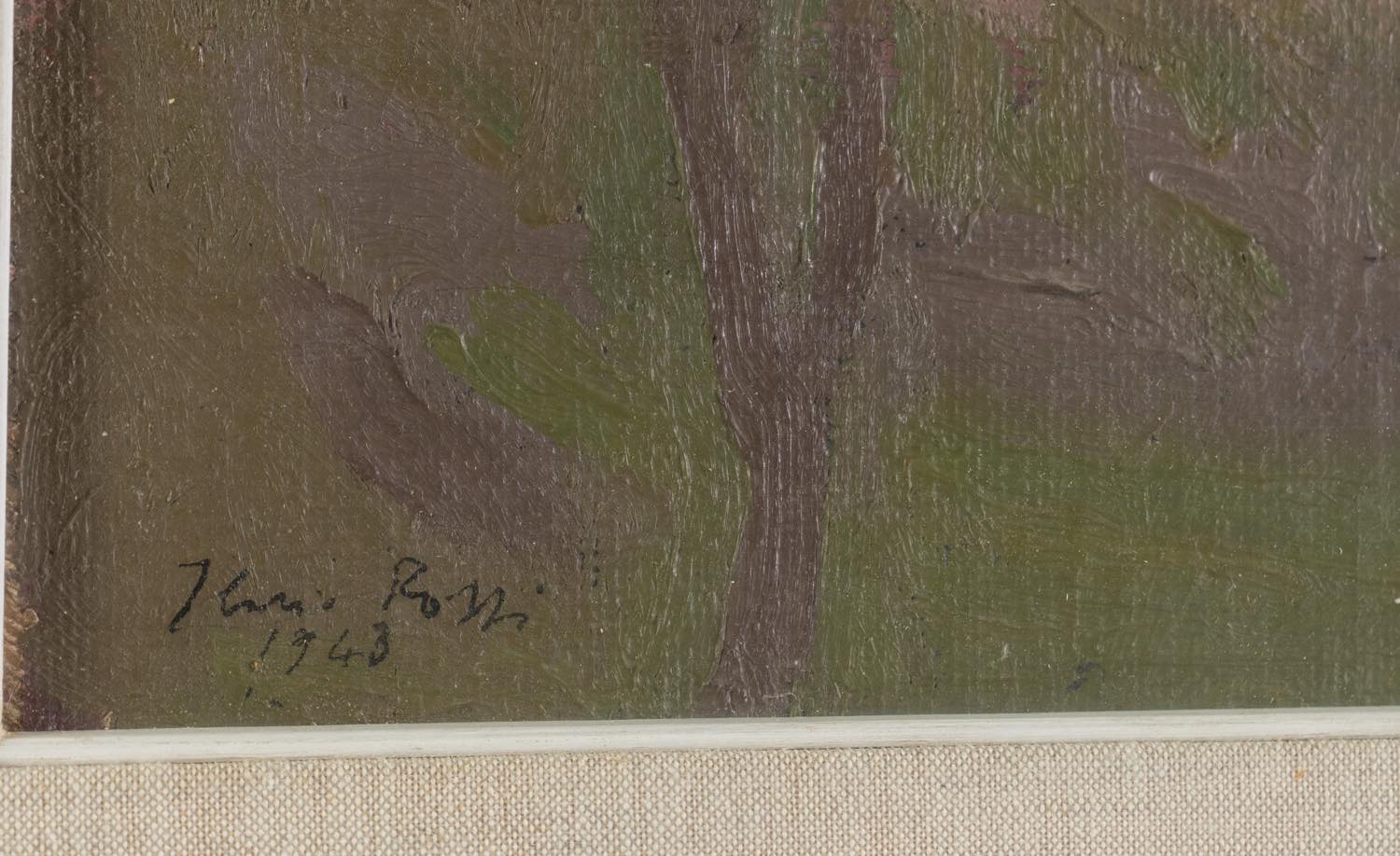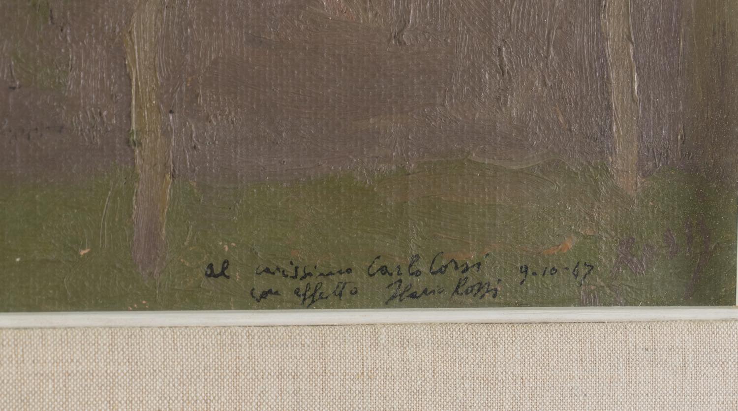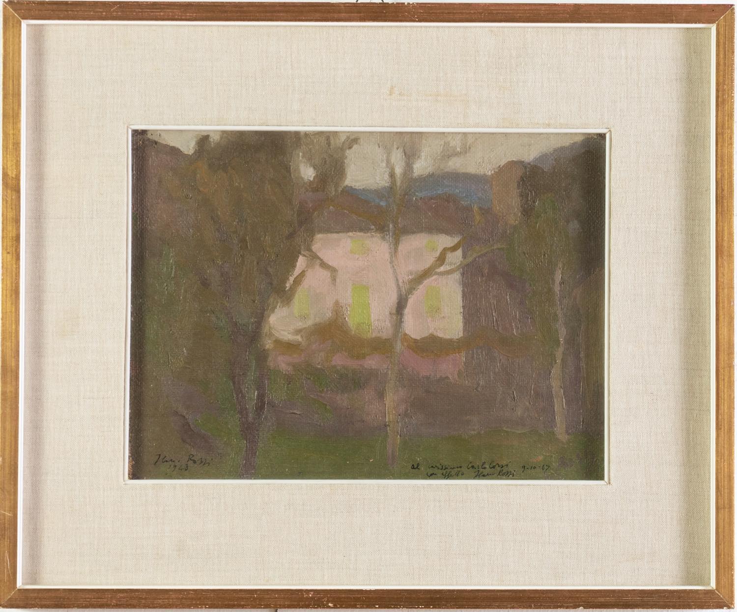 Ilario Rossi (Bologna 1911 – 1994), “Casa Rosa”, 1943. - Olio su tela applicata a tavoletta, firmato e datato in basso a sinistra, reca in basso a destra dedica datata 1947 “Al carissimo Carlo Corsi / Con affetto Ilario Rossi”, H cm 27x35.5