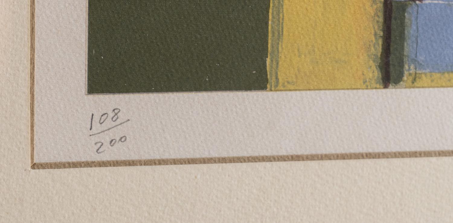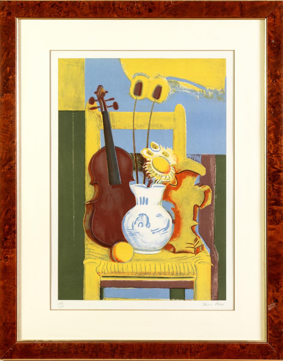 Ilario Rossi (Bologna 1911 – 1994), “Natura morta con violino”. - Litografia a colori su carta firmata in basso a destra, numero di tiratura in basso a sinistra 108/200, reca al retro timbro e firma della Galleria Marescalchi – Bologna, Lastra H cm 52x36