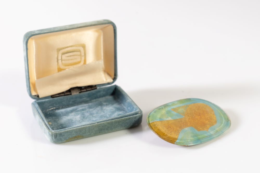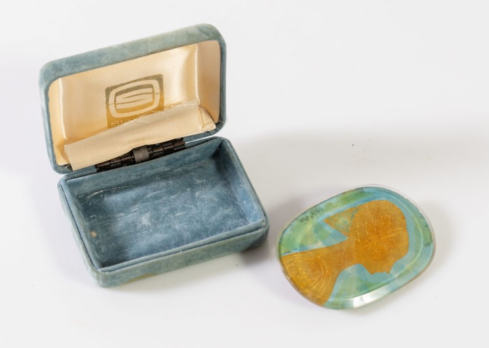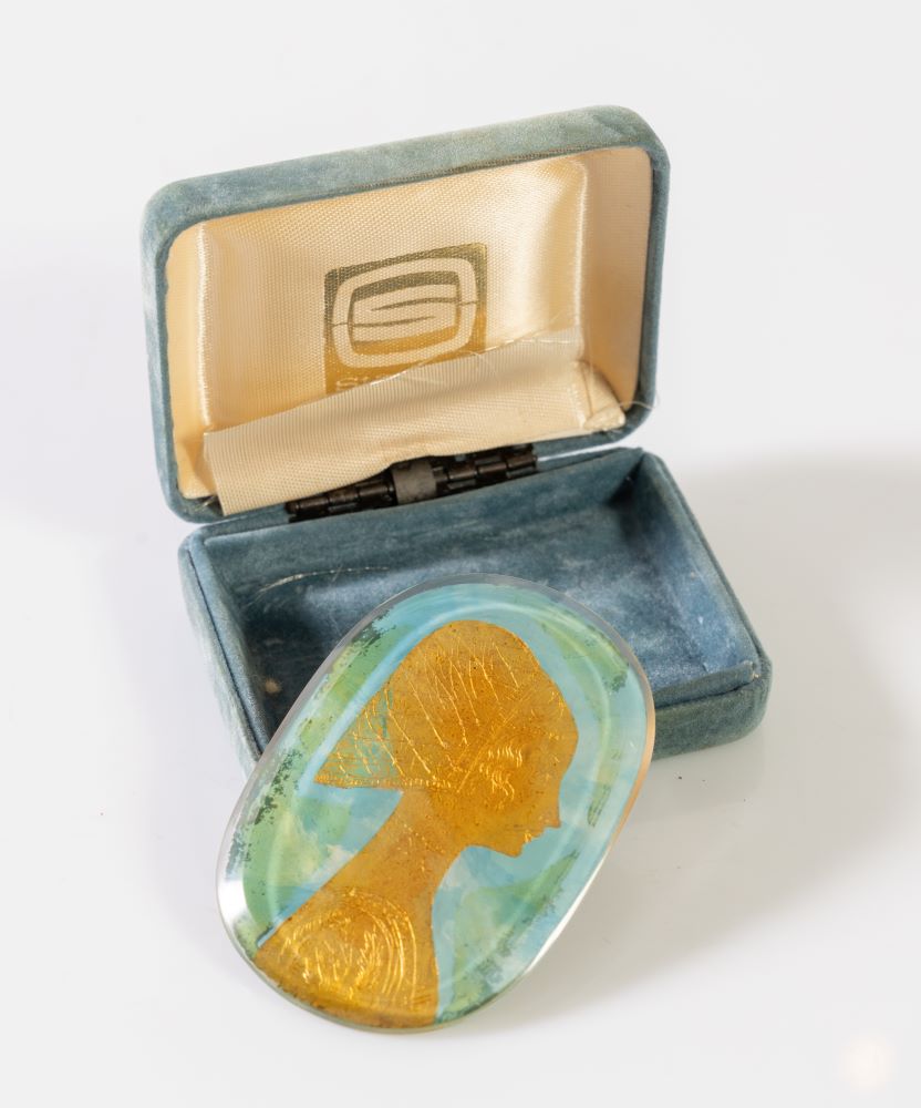Angelo Bragalini (Fidenza 1913 - Bologna 1994) attr. Spilla cammeo. Profilo di testa femminile rinascimentale con lavorazione in foglia d'oro. Scatola non originale.