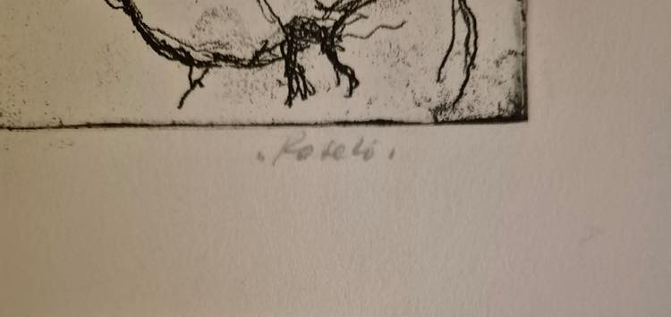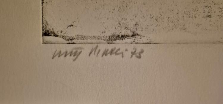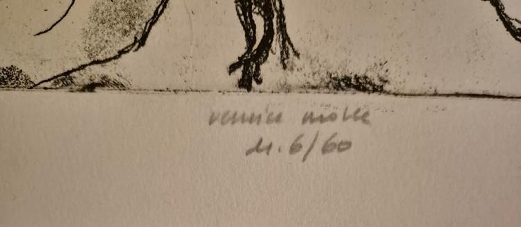 Acquaforte, vernice molle. Esemplare 6/60. Firmato, titolato e datato in lastra in alto a destra. Titolato a matita in basso a destra. Firmato e datato a matita in basso a sinistra. Tecnica e numerazione a matita in basso al centro.