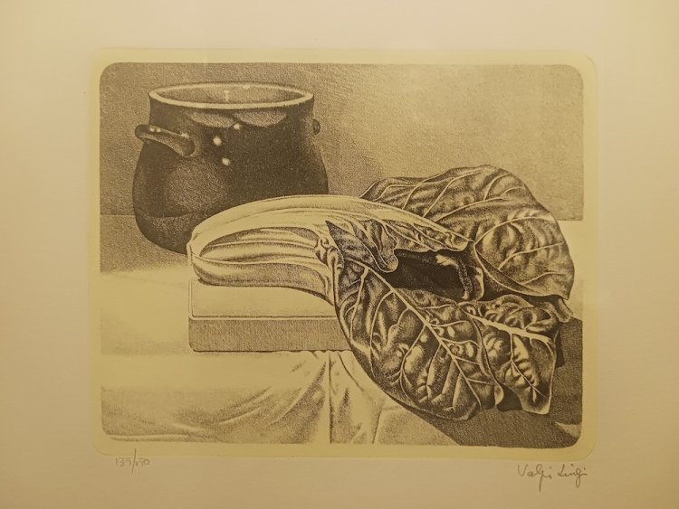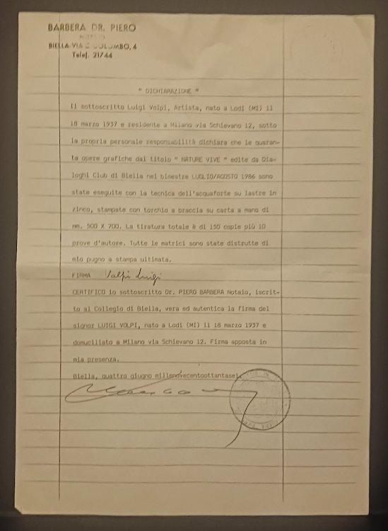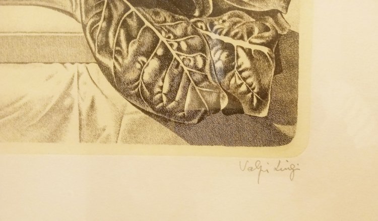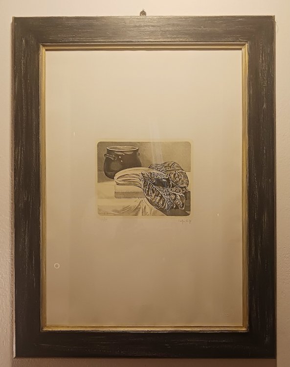 Acquaforte su lastra in zinco. Numerata a matita in basso a sinistra 135/150. Firmata a matita in basso a destra. Stampata con torchio a braccia su carta a mano. Tiratura totale di 150 copie più 10 prove d'autore. Tutte le matrici distrutte dall'artista a stampa ultimata. Con cornice e vetro.