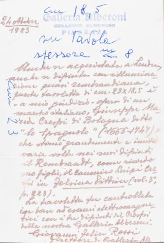 Olio su tavola. Perizia a firma Giovanni Felice Rossi, direttore della Galleria Alberoni, Piacenza, in data 24 ottobre 1983.