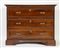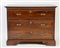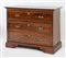 Piccolo canterano in massello di noce. Con tre cassetti sul fronte. Piano a becco di civetta. Cornicione alla base sorretto da piedi a mensola traforati. Ferramenta coeva.