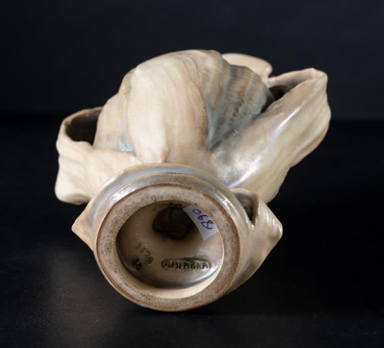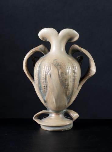 A forma di piccola anfora in guisa di pannocchia, con foglie avvolgenti dalla base intorno al corpo del vaso.Sotto la base marchio impresso AMPHORA in un'ovale e cifre impresse.