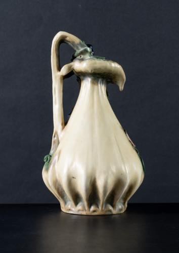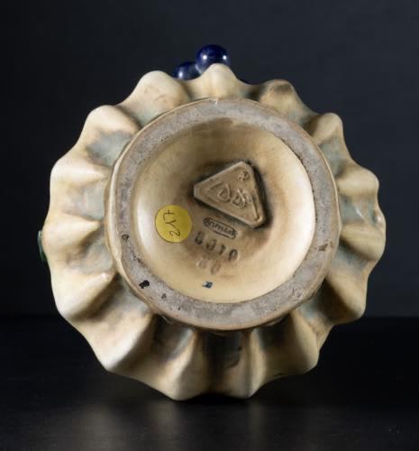 Nei toni del verde, del rosa e del color biscotto con decorazione di tralci di vite e grappoli di uva con acini blu a tutto rilievo.