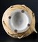 In porcellana con impugnatura a forma di tralcio vegetale rampicante, sul corpo del vaso decorazioni floreali con punteggiature color oro su entrambi i lati.