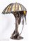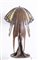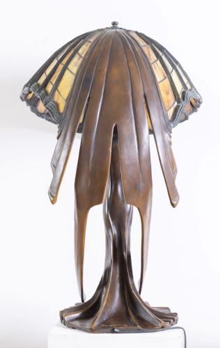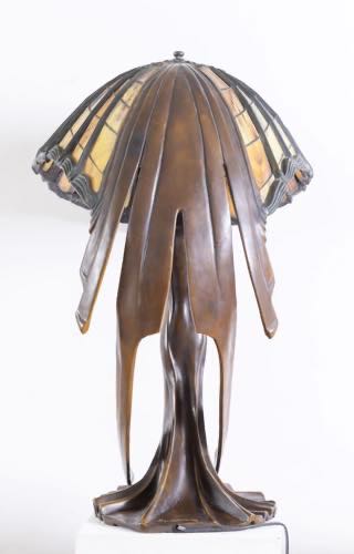 Lampada da tavolo con paralume in tessere di vetro nei toni del giallo, verde e arancio legate a piombo a disegni geometrici. Base in bronzo a patina scura a guisa di fanciulla che sorregge il paralume, come Atlante sorregge il globo. Da un disegno del 1902 di Peter Beherens. Firmata Behrens KT sulla base. Peso circa 30 kg. Realizzata negli anni '80. Produzione Tiffany Art Glass s.a.s. - di Reggianini & Co. Carpi, Modena. Modello LB 65 LB 65 S. Note L'unico esemplare originale fu disegnato da Peter Behrens per gli interni dell'edificio residenza della Colonia degli artisti di Darmstadt, dove un gruppo di artisti dello Jugendstill vissero e produssero le loro opere. Attualmente conservata presso Hessian House Wissenschaftsstadt, Darmstadt.