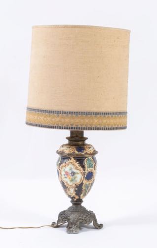 Lampada da tavolo in metallo smaltato decorata con motivi floreali entro riserve.
