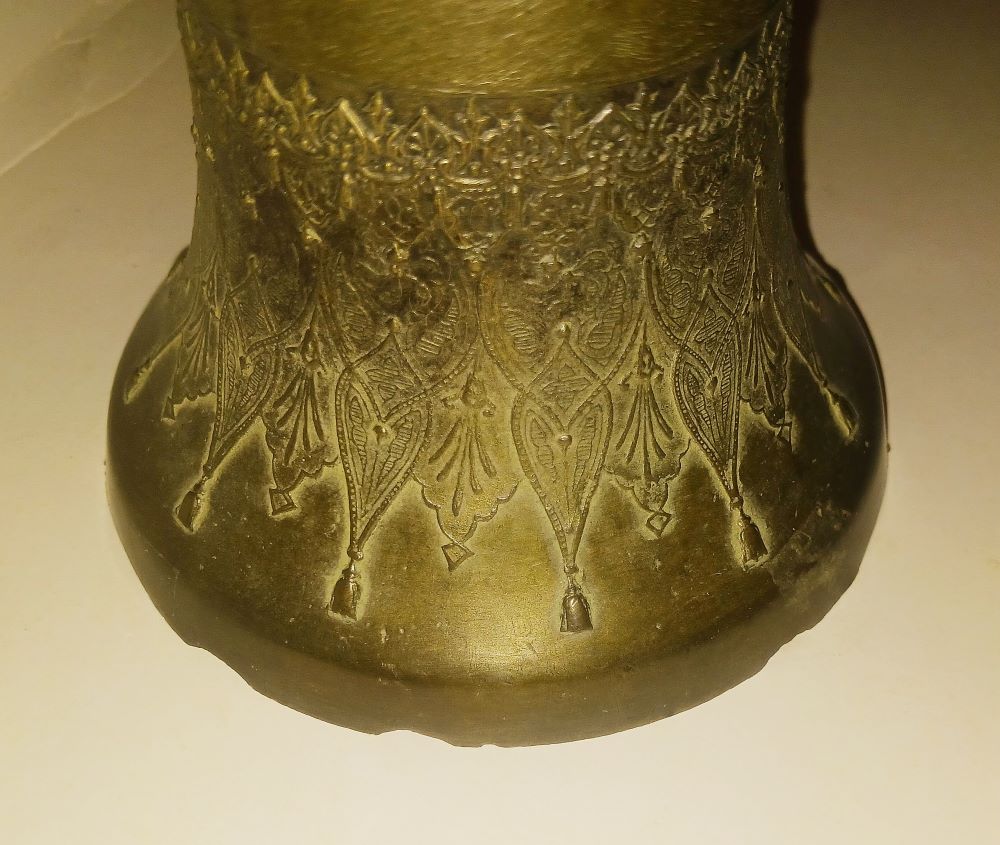 Cesellata su tutta la superficie esterna. Impugnatura in legno. Lievi usure sul bordo inferiore. Peso gr. 1250.