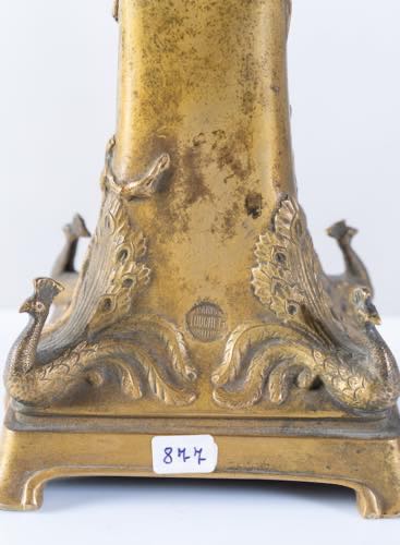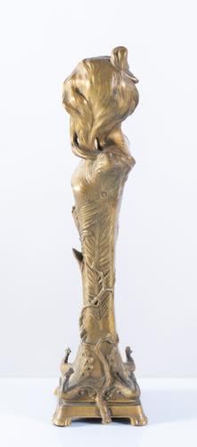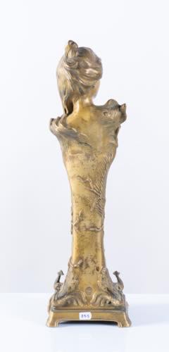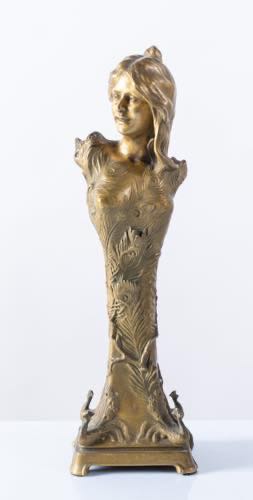 Raffigurante busto femminile, circa 1900. Alla base decorazione di quattro pavoni. Presenta sul fusto una decorazione con piume di pavone degradanti fino al busto femminile. Sulla base al retro firma L. Savine e marchio della fonderia Paris Louchet Ciseleur.
