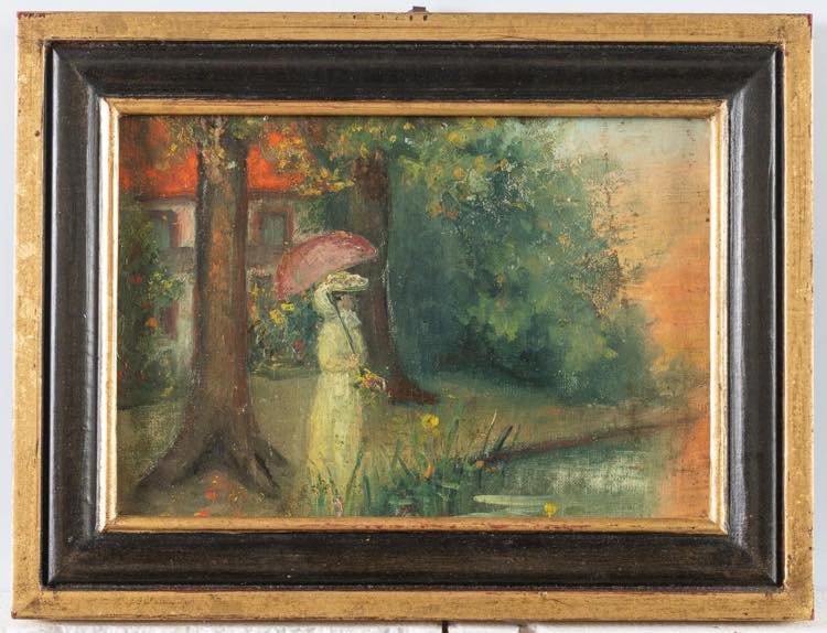 Pittore francese tra XIX e XX secolo. Passeggiata con ombrellino. Cm19x27. Olio su tela.