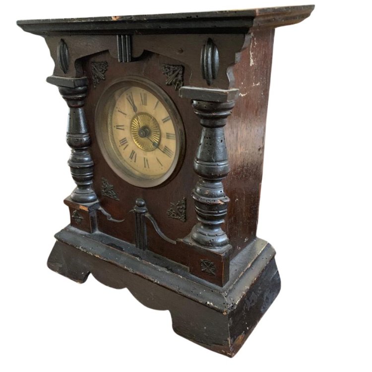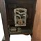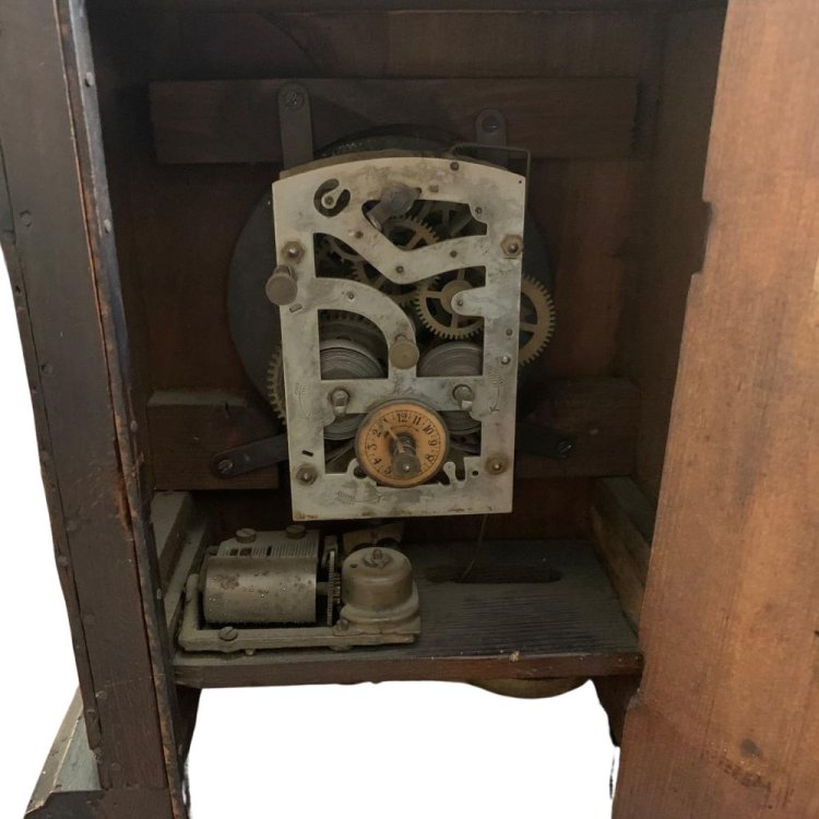 Il meccanismo è del tipo bilancere. Sul retro un piccolo sportello consente di aprire il vano del meccanismo per la carica delle molle, l'impostazione della sveglia e la messa in orario dell'orologio. Cassa in legno con elementi bronzo. Antica etichetta non leggibile sulla parte interna dello sportellino posteriore.