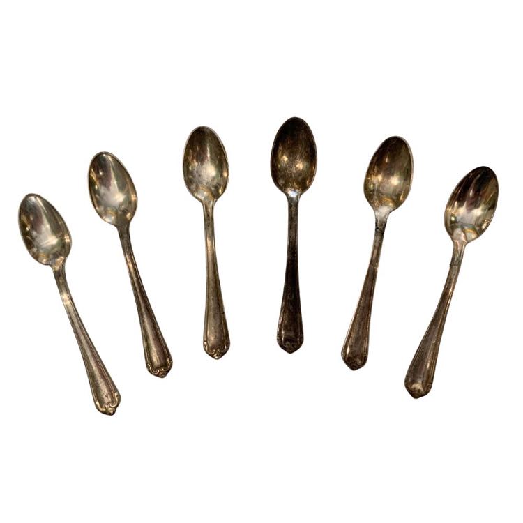 Lotto composto da sei cucchiaini da caffè in metallo argentato. Cucchiaini lunghezza cm. 10,5.