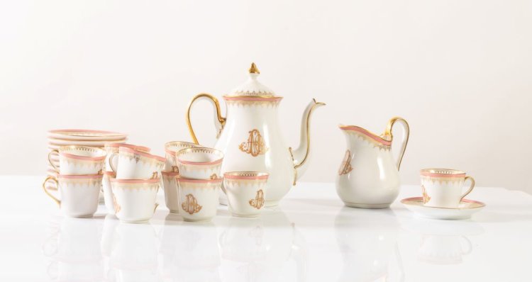 Bordo decorato esternamente da una sottile fascia rosa. Decorazioni di filettature e rifiniture in oro. Sulla circonferenza esterna decorazione di monogrammi. Servizio per 12 persone composto da caffettiera, lattiera, 12 tazzine con 12 piattini. Marchio stampato GINORI in verde.