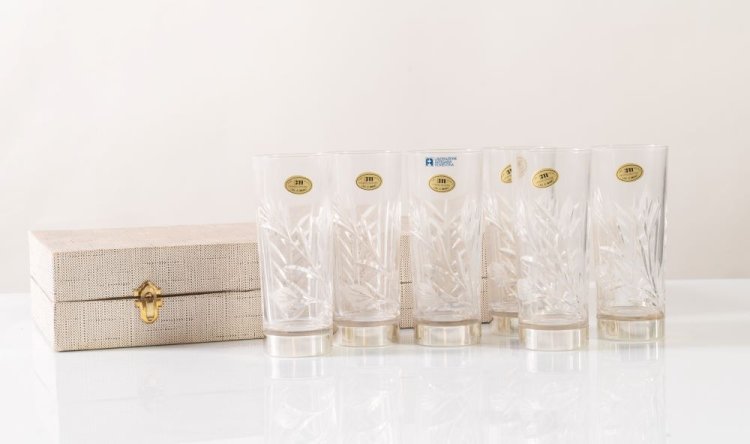 Sei bicchieri alti in cristallo inciso a mano. Fascia d'argento 800 SI alla base. Etichetta Lavorazione Artigiana Fiorentina. Etichetta CM Puro Cristallo. Con scatola originale.