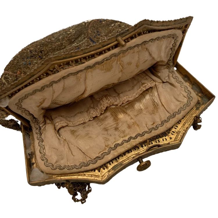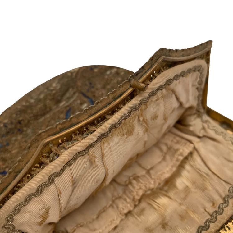 Chiusura e catenella in metallo dorato. Interno in raso e passamaneria color crema. Difetti.