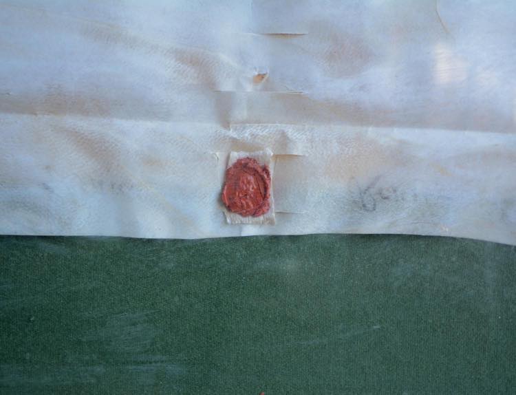 Scritto a mano, sigillo rosso in ceralacca, bolli impressi azzurro con argento. In cornice con vetro.