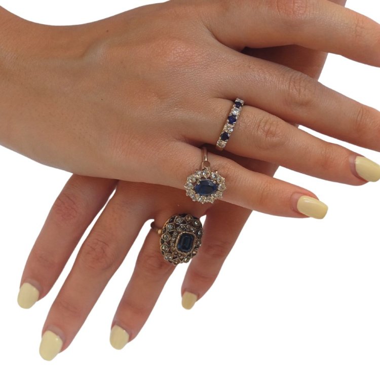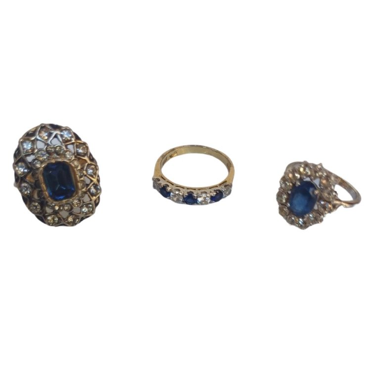 Il primo realizzato come un ovale in stile déco, centrato da pietra in pasta vitrea blu e micro brillantini incastonati ai lati. Il secondo realizzato a riviera con alternanza di brillanti blu e bianchi. Il terzo lavorato come una margherita, ornato da brillanti e pietra centrale ad imitazione dello zaffiro.