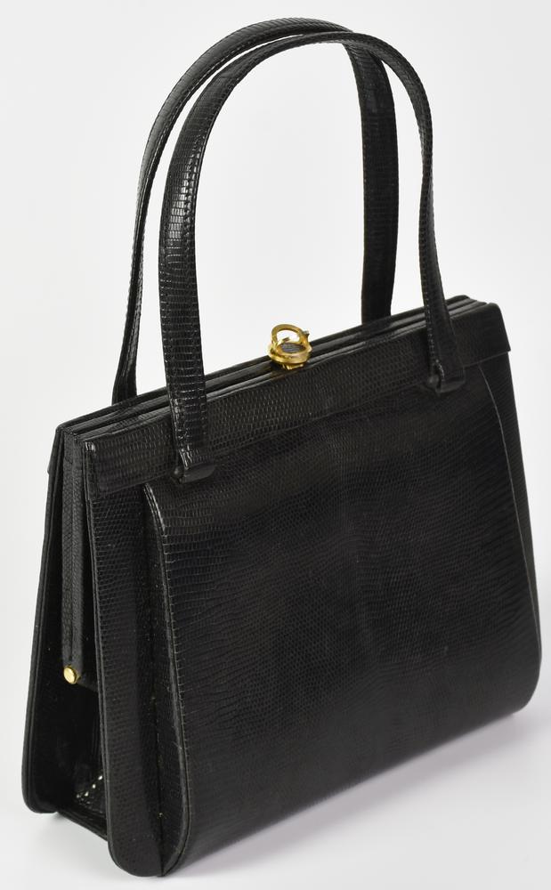 Borsa a mano in pelle stampata nera a due manici. Chiusura a scatto. Interno in pelle nera organizzato in uno scomparto e tre taschini laterali di cui uno piatto, uno a soffietto e uno a cerniera. Hardware in metallo dorato. Cm 22,50x17x10. Altezza con manico cm 27,50. Segni d’uso e del tempo. Ben conservata.