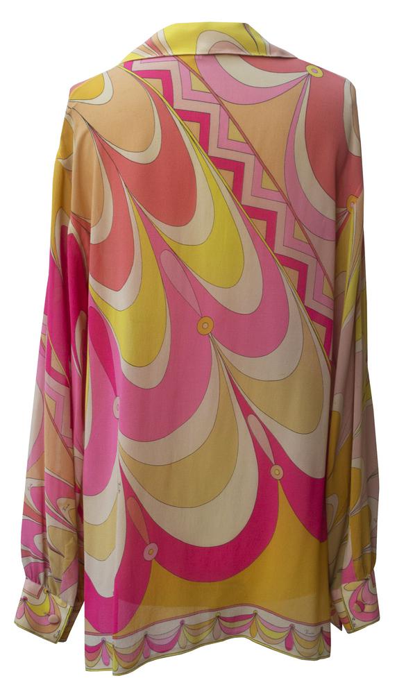 Printed silk georgette for this long-sleeved shirt. Colors from pink to yellow tones. Fabric covered buttons. Made in Florence for Bergdorf Goodman in the 1960s, size IT 42.