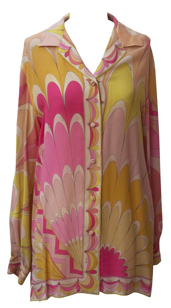 Georgette di seta stampata per questa camicia a maniche lunghe. Colori dai toni rosa al giallo. Bottoni ricoperti in tessuto. Prodotto a Firenze per Bergdorf Goodman negli anni '60, Taglia IT 42. Leggeri aloni sul fondo della manica sinistra. Discretamente conservato, e' presente un alone e un piccolo strappo ben ricucito.