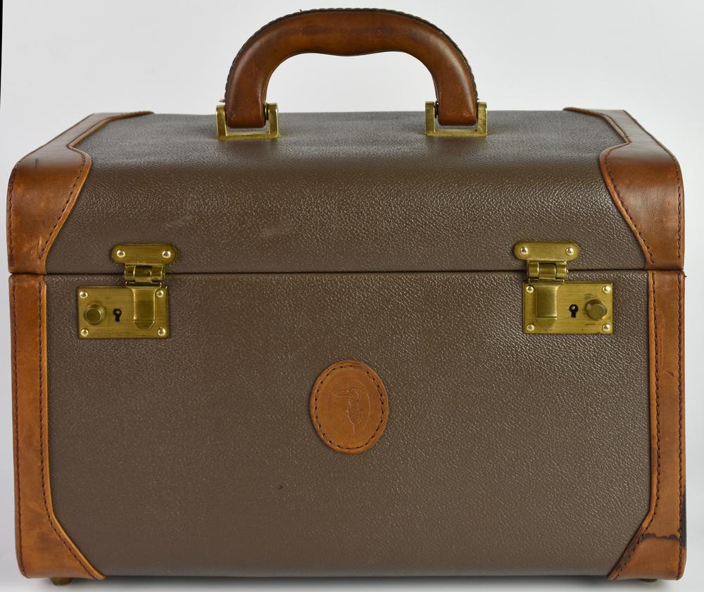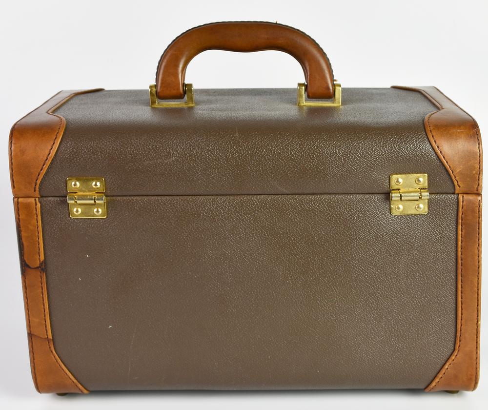 Beauty case in pelle con manico rigido e chiusura a scatto. Interno foderato in tessuto con finiture in pelle. Dotato delle chiavi originali. Metalleria in metallo dorato. Anni ’80. Cm 31,50x20x20. Ben conservato.