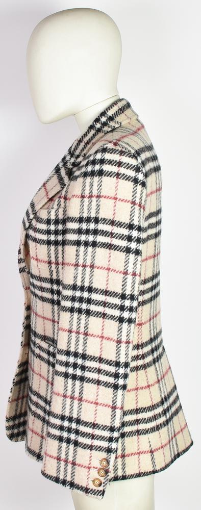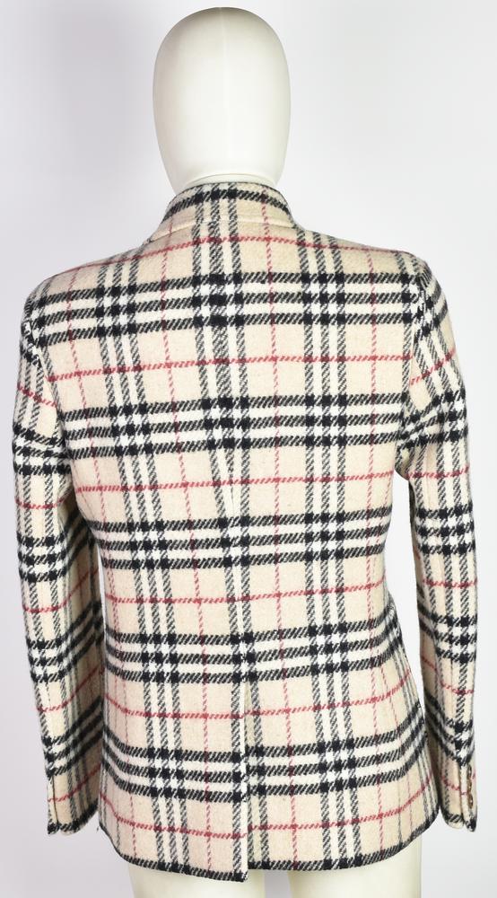 Giacca da donna a due bottoni in lana nell'iconico motivo della Maison. Presenta due tasche e un taschino applicati. Taglia 10 UK. Prodotto in Italia. Perfettamente conservata.