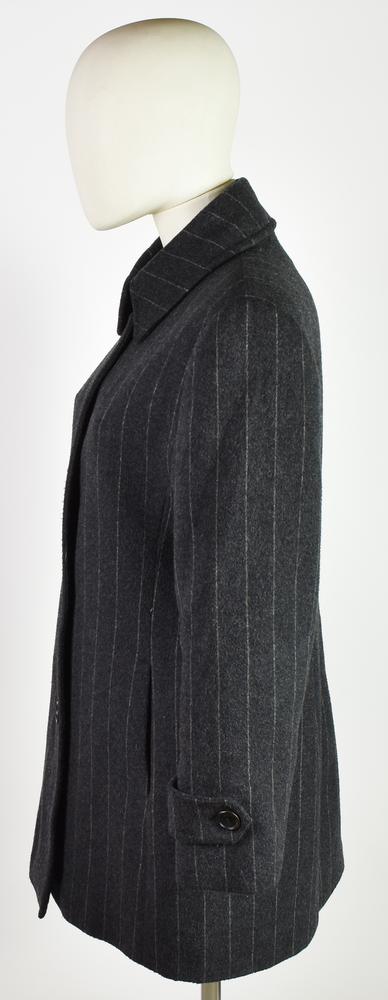 Grey pinstriped wool blend coat. Features branded buttons, flap pockets, and an inner pocket. Size 42 IT. Perfectly preserved.