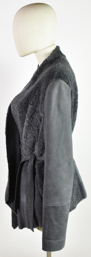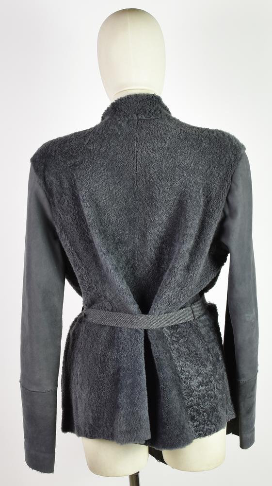 Giacca in pelle e pelliccia con dettagli in kashmir sulle maniche. Taglio a vivo e cintura in cashmere. Anni 2000. Taglia 48 IT. Prodotto in Italia. Perfettamente conservata.