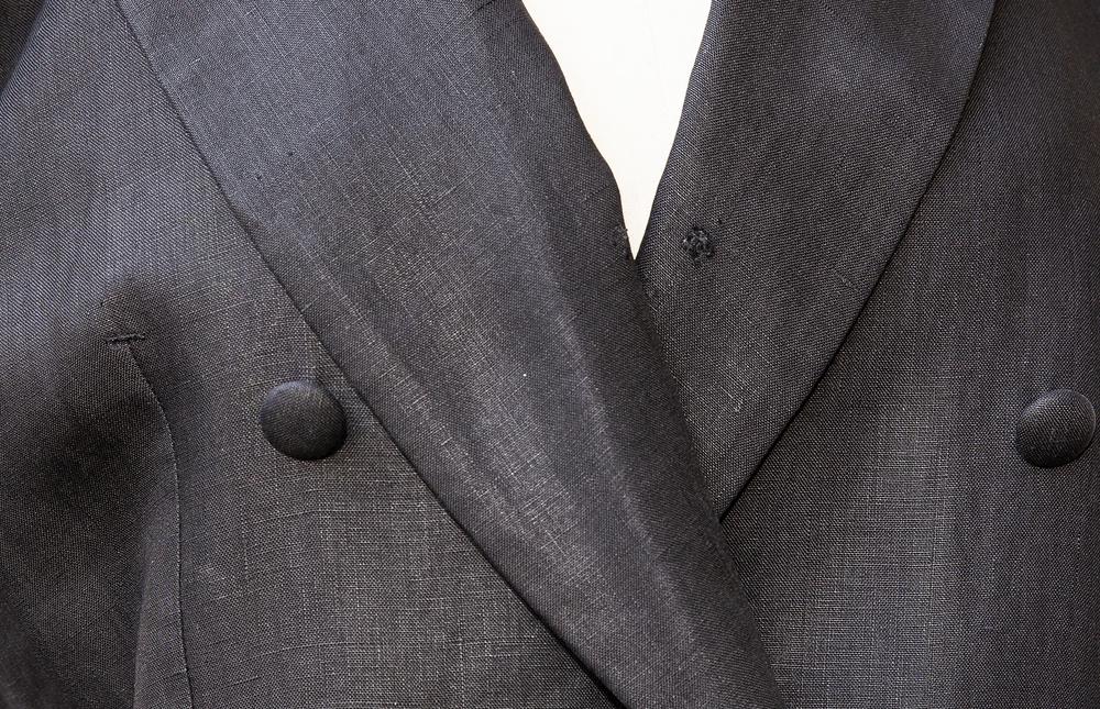 Unlined and sleeveless double-breasted black linen jacket with detail of the shoulder cut into fabric braces. Size 42. Made in Italy in the 80s. Well preserved.