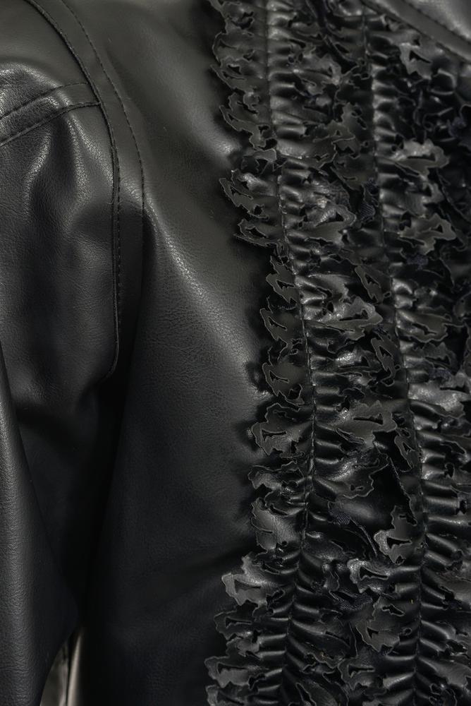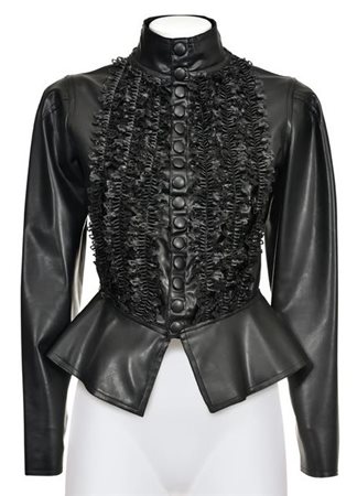 Faux leather bustier jacket from Fall Winter 1996 collection. Laser cut ruffles at front. Snap buttons closure. 55x100 polyurethane, 36x100 polyamide, 9x100 elastan. Size is IT 42. Excellent Conditions.