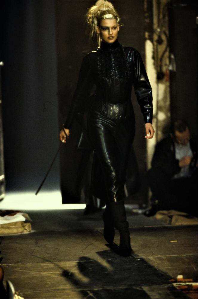 Giacca bustier in ecopelle della collezione Autunno Inverno 1996. Volant tagliati al laser sul davanti. Chiusura con bottoni a pressione. La composizione e' 55x100 poliuretano 36x100 poliammide 9x100 elastan. La taglia e' una IT 42. Eccellente.
