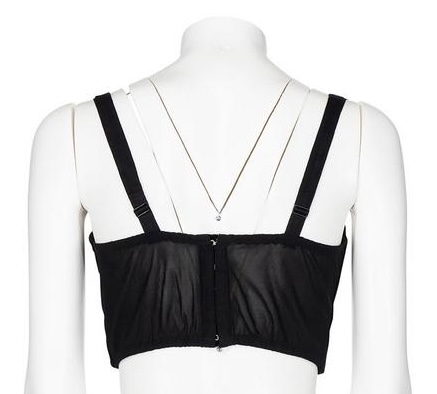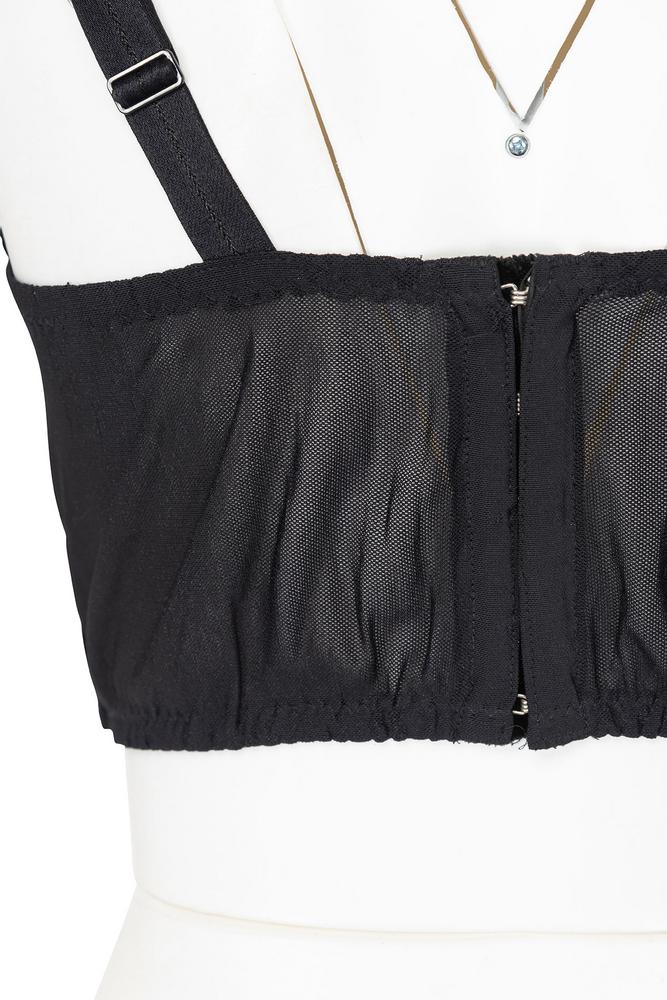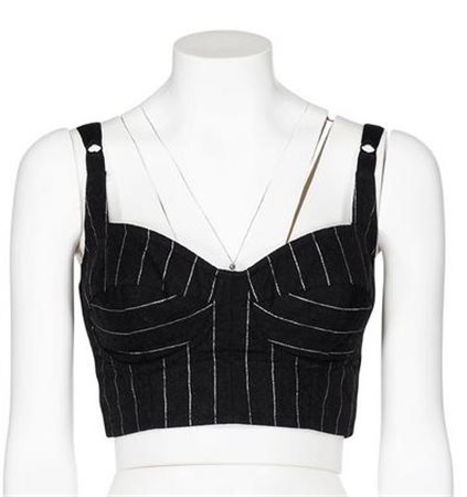 Iconic pinstripe corset with lurex from the 90's. Adjustable shoulder straps. Stretched elastic at back with hooks. 100x100 wool. Size is IT 46. Well Preserved, elastic at back is slightly loose.