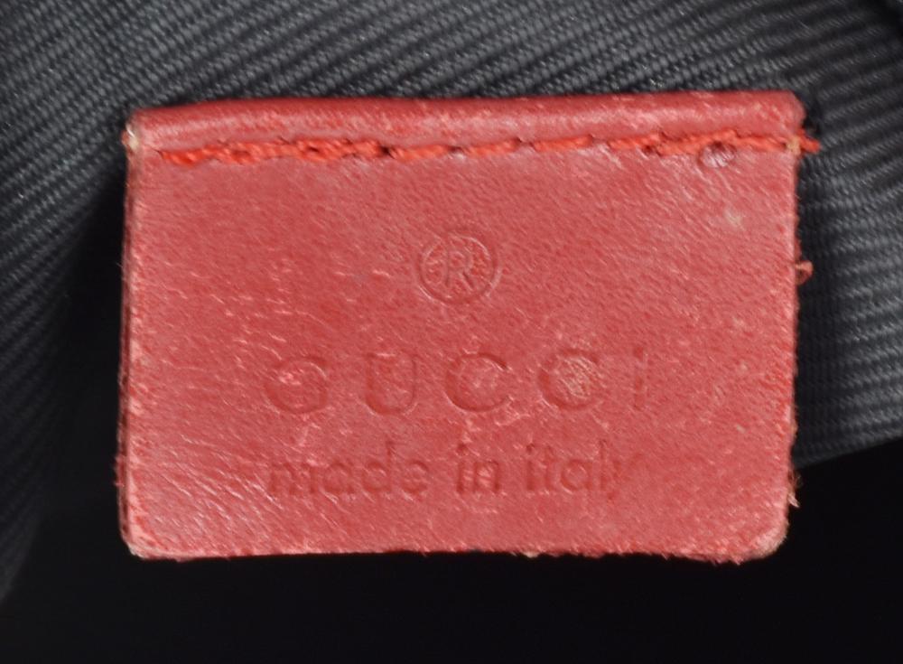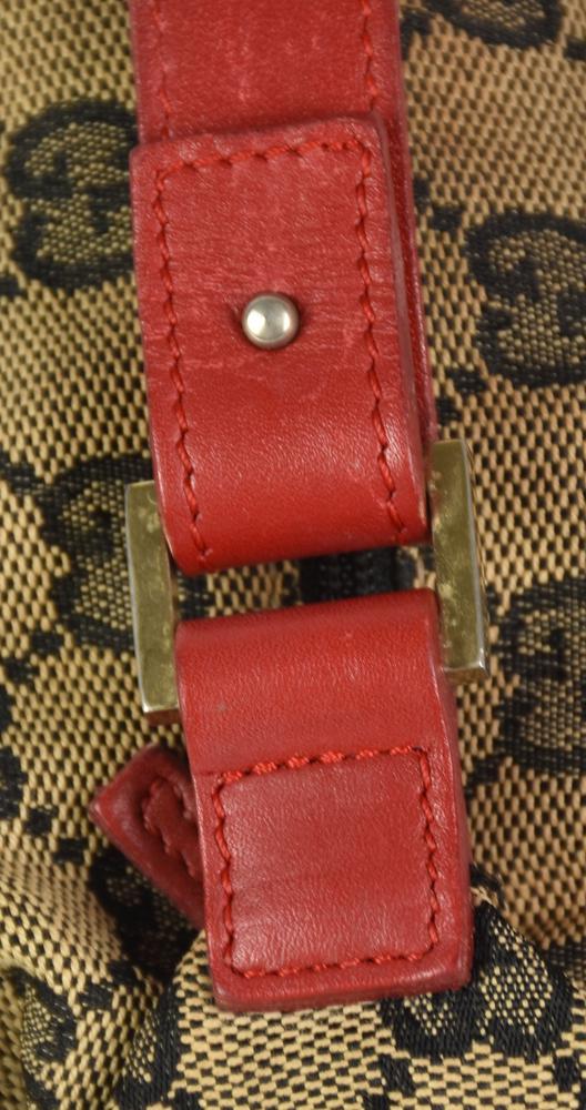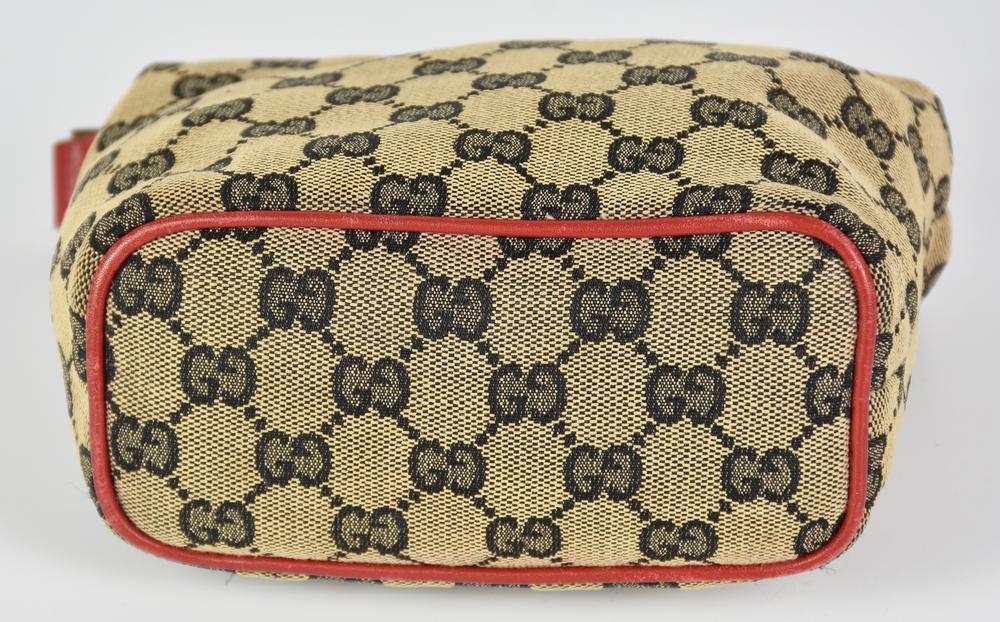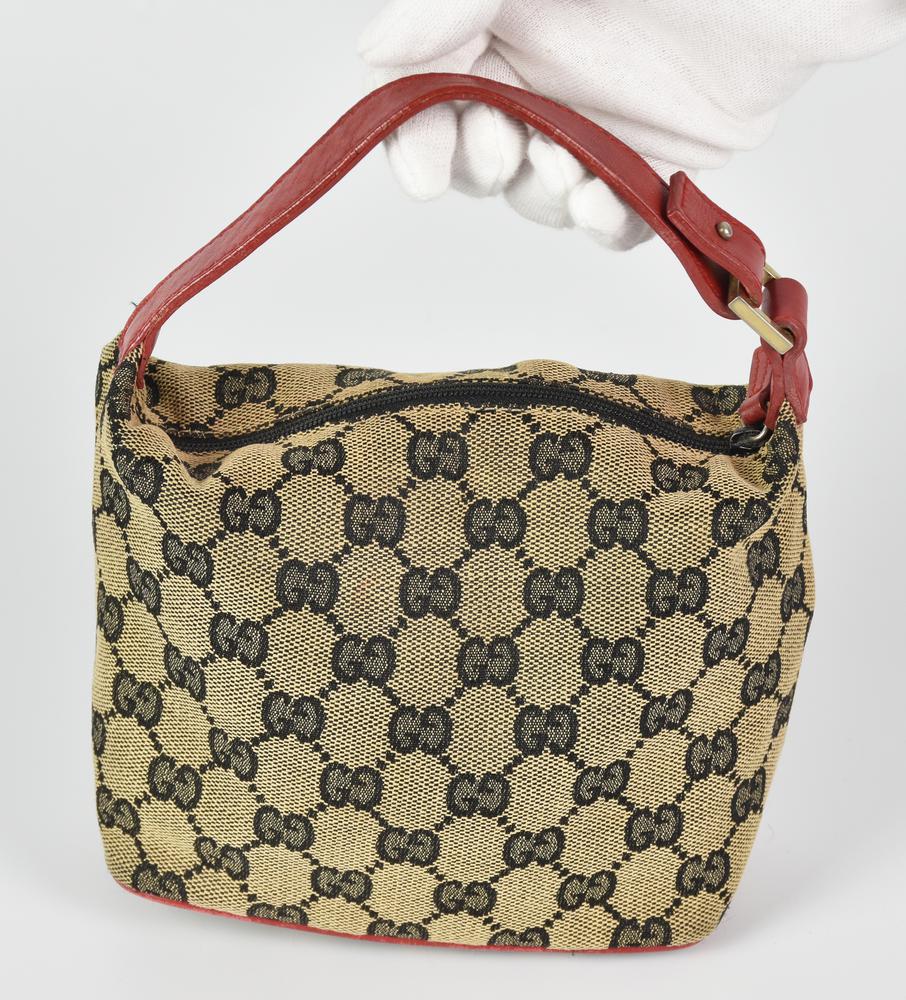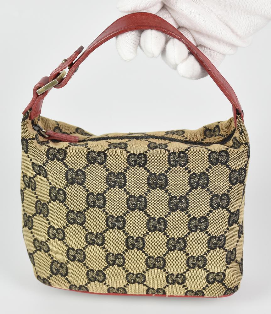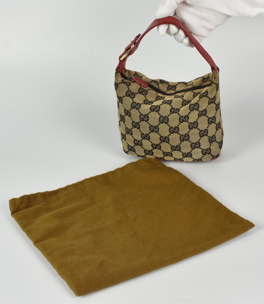 Piccola borsa a mano in tela Guccissima con manico e profilature in pelle rossa a contrasto. Chiusura con cerniera. Interno organizzato in un unico vano. Cm 20,00x14,00x7,50. Altezza con manico cm 19,50. Corredata di dustbag originale. Codice di riferimento prodotto: 039 1147 002 058. Prodotta in Italia. Ben conservata.