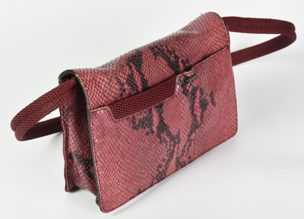 Piccola borsa a spalla bordeaux in tessuto tecnico e pitone. Chiusura con patta frontale con velcro. Interno organizzato in un unico vano con un taschino laterale con cerniera. All’esterno reca un taschino posteriore con chiusura con velcro. Cm 23,50x15x6. Prodotto in Italia. Presenta lievi segni d’uso. Ben conservata.