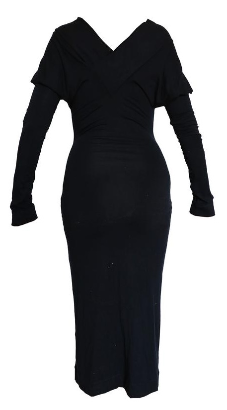 Long dress in black viscose jersey with glove sleeves and wide neckline that can also be worn resting on bare shoulders. Made in Italy in the 90s. Size L. Perfectly preserved.