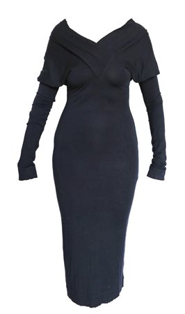 Abito lungo in jersey di viscosa nero con maniche a guanto e ampia scollatura che si puo' portare anche appoggiata sulle spalle scoperte. Made in Italy negli anni '90. Taglia L. Perfettamente conservato.