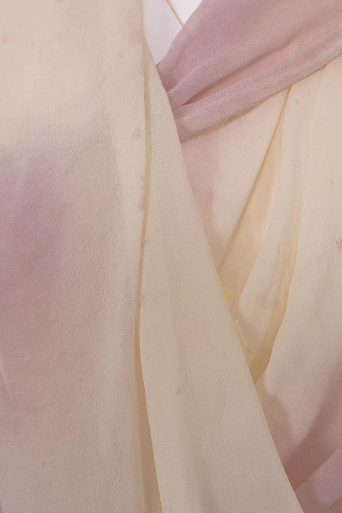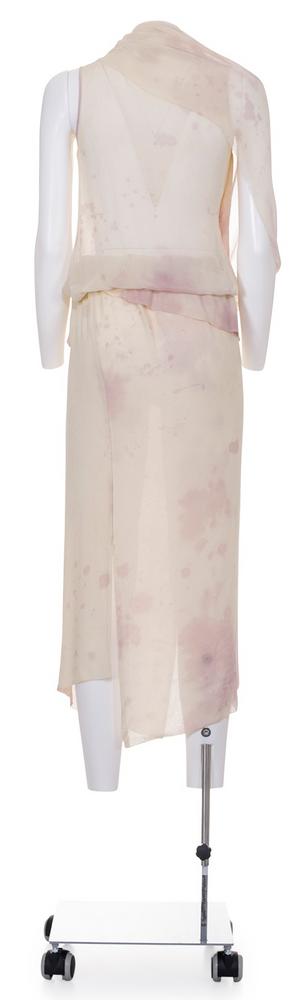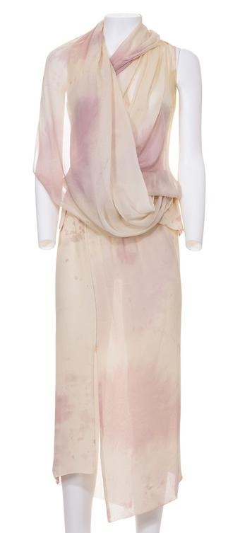 Abito midi in seta con drappeggio frontale e spacco su entrambi i lati della collezione Primavera Estate 2000 'Summertime'. Vita elasticizzata. Effetto macchie di vino. 100x100 seta. Senza etichetta taglia, veste come una IT 42. Discretamente Conservato, aloni al giromanica, alcuni leggeri segni sul fondo.