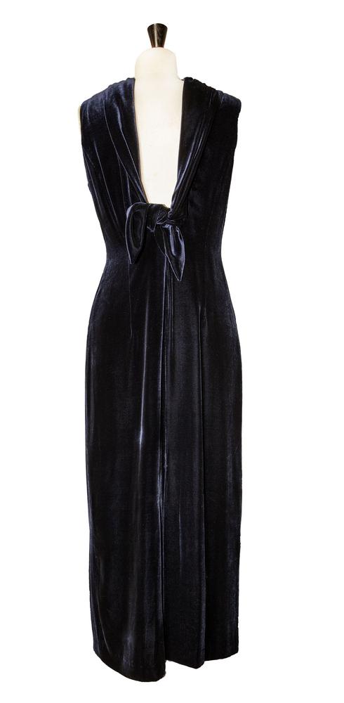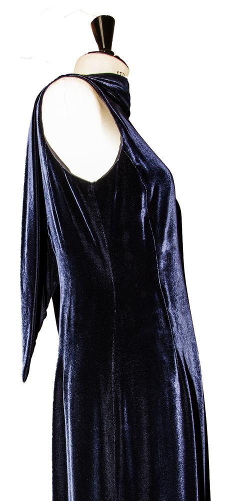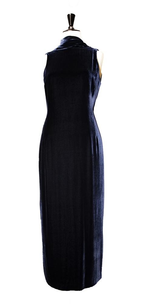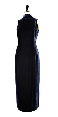 Abito in velluto panne' di viscosa e seta colore blu, taglia 42. Anno 2000. Profonda scollatura sulla schiena e scialletto che si puo' portare allacciato o slacciato. Perfettamente conservato.