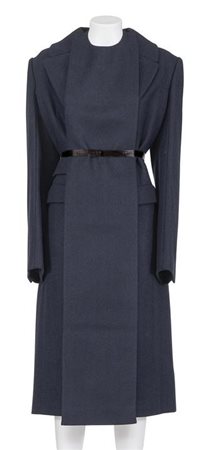 Iconico e raro cappotto in lana a taglio vivo della collezione Autunno Inverno 2002. Plastron con cintura in raso. 100x100 lana. La taglia e' una IT 42. Eccellente.